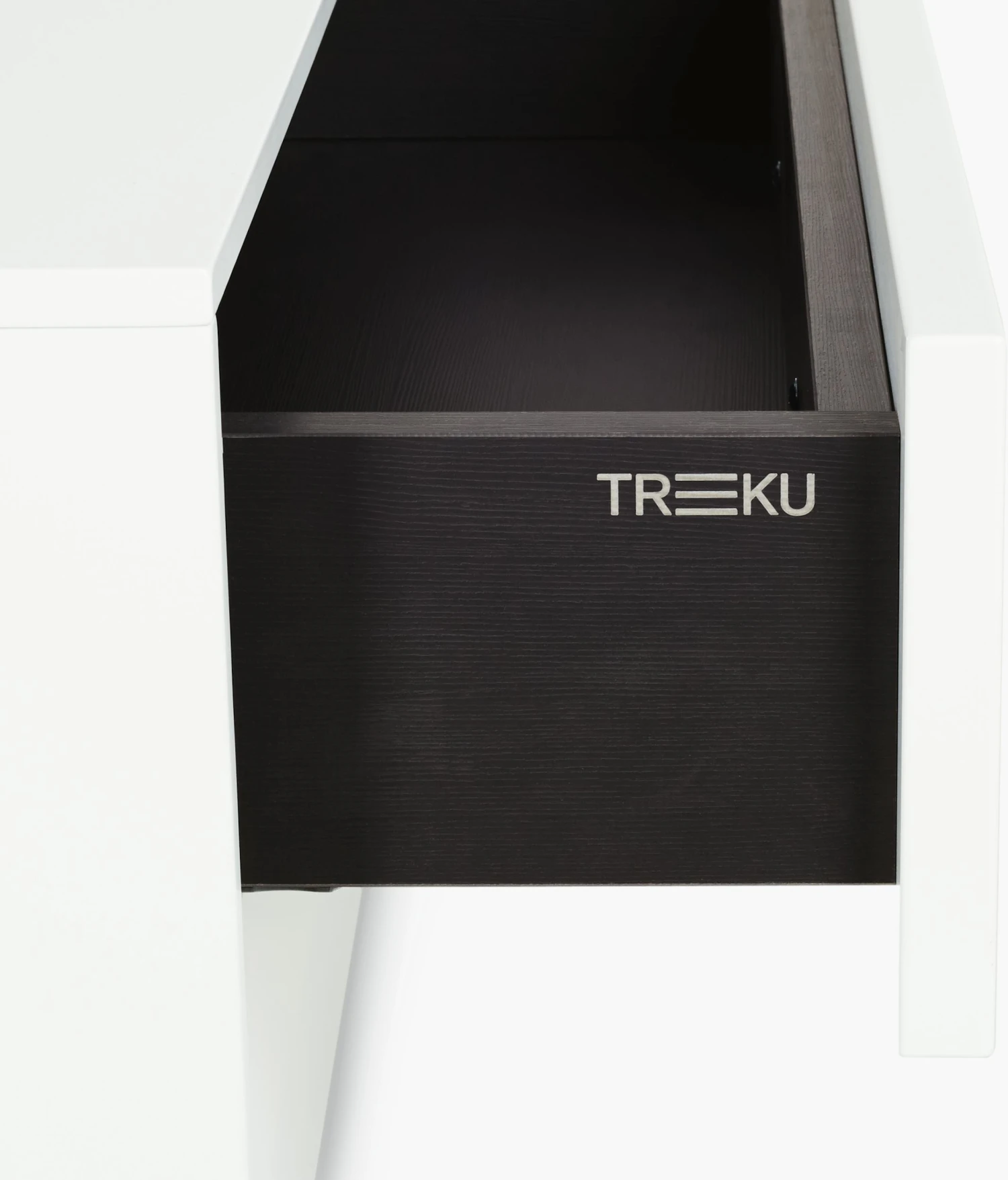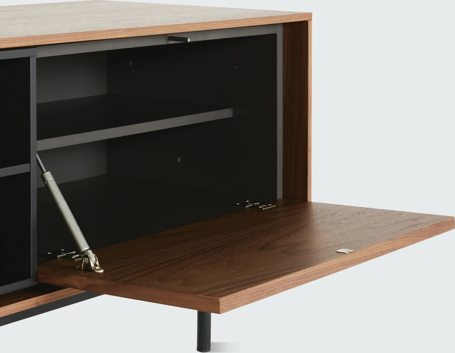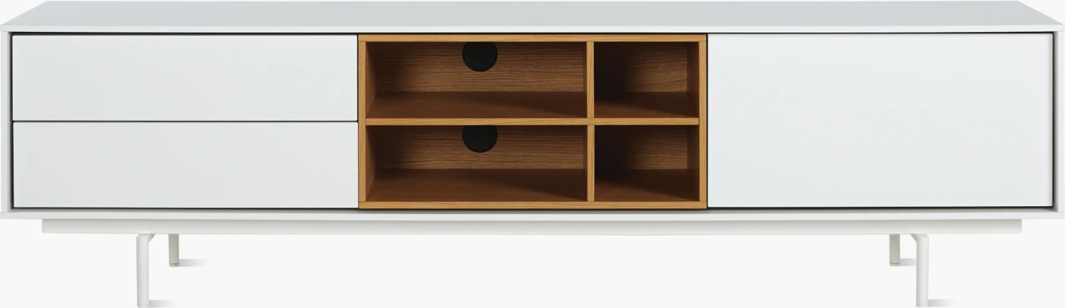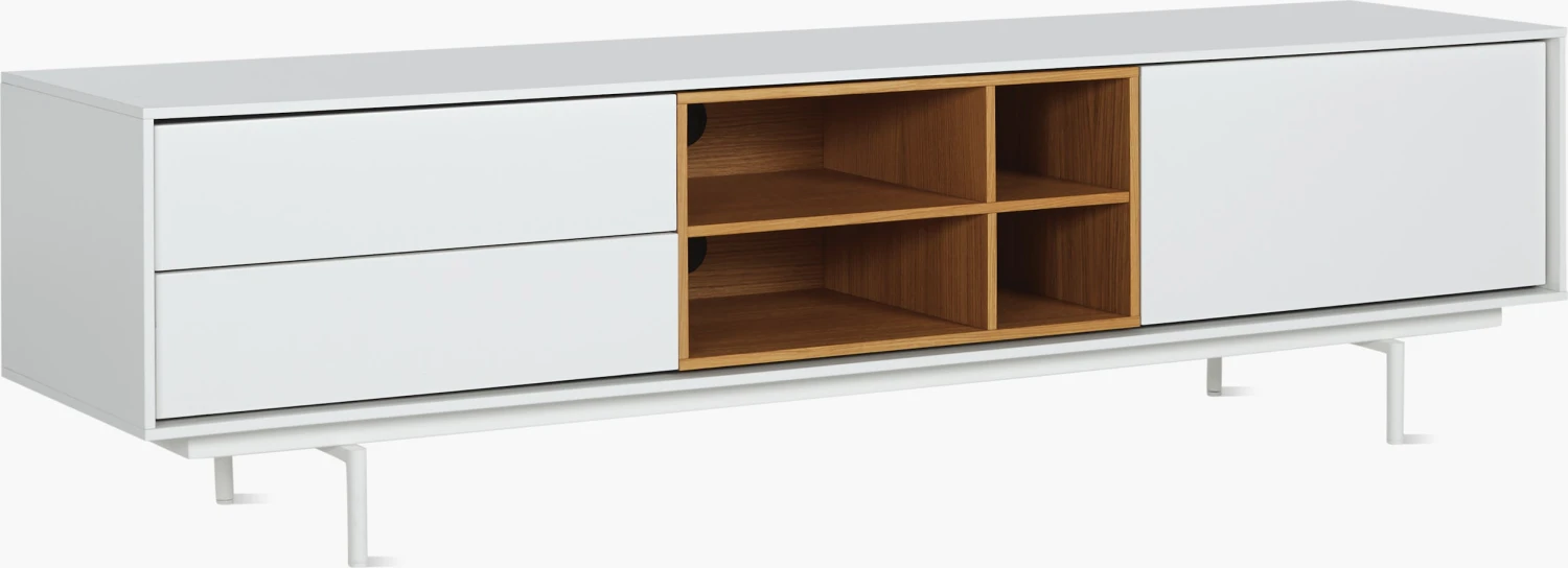 Founded in 1947, the Spanish company Treku specializes in sleek storage units that combine modern and traditional design details. The Aura Media Unit (2011) is an eye-pleasing two-tone storage solution that combines the beauty of clean lines with the durability of fine craftsmanship. The open-frame steel base ensures a visual lightness while also delivering exceptional sturdiness. Aura is finished partly in wood veneer, partly in lacquer for warmth and striking contrast. Made in Spain.