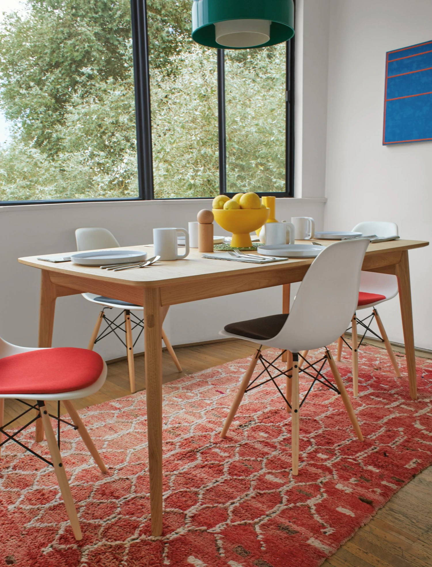 - Rectangular table comes with two leaves; seats up to 10 people.