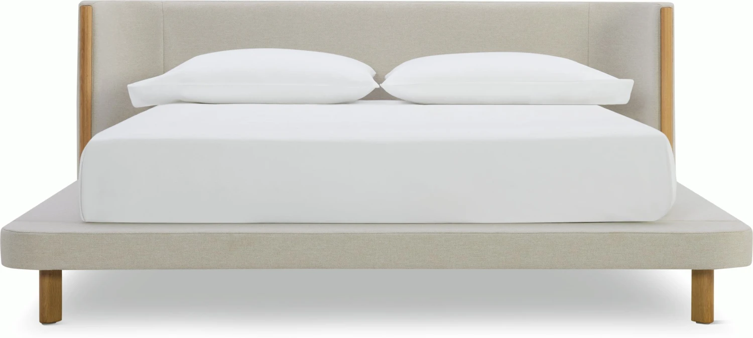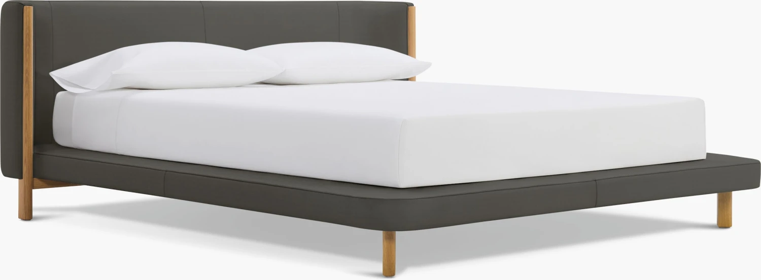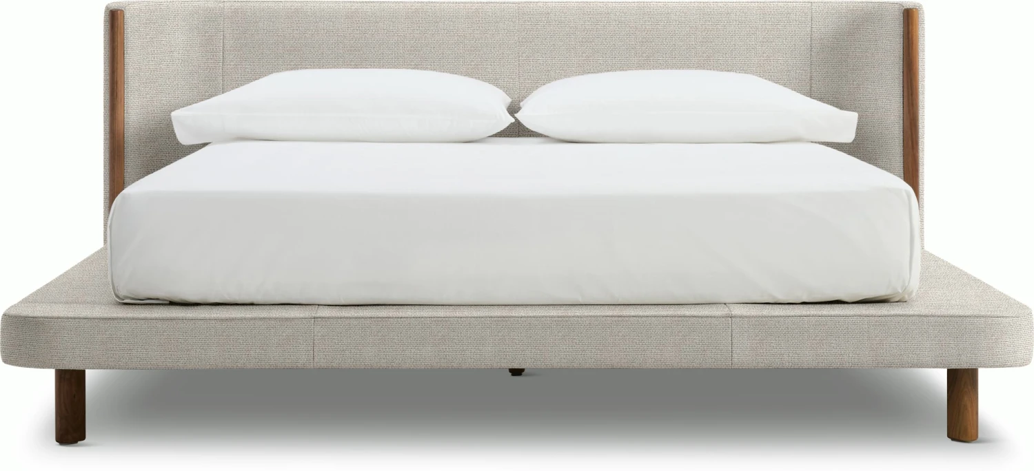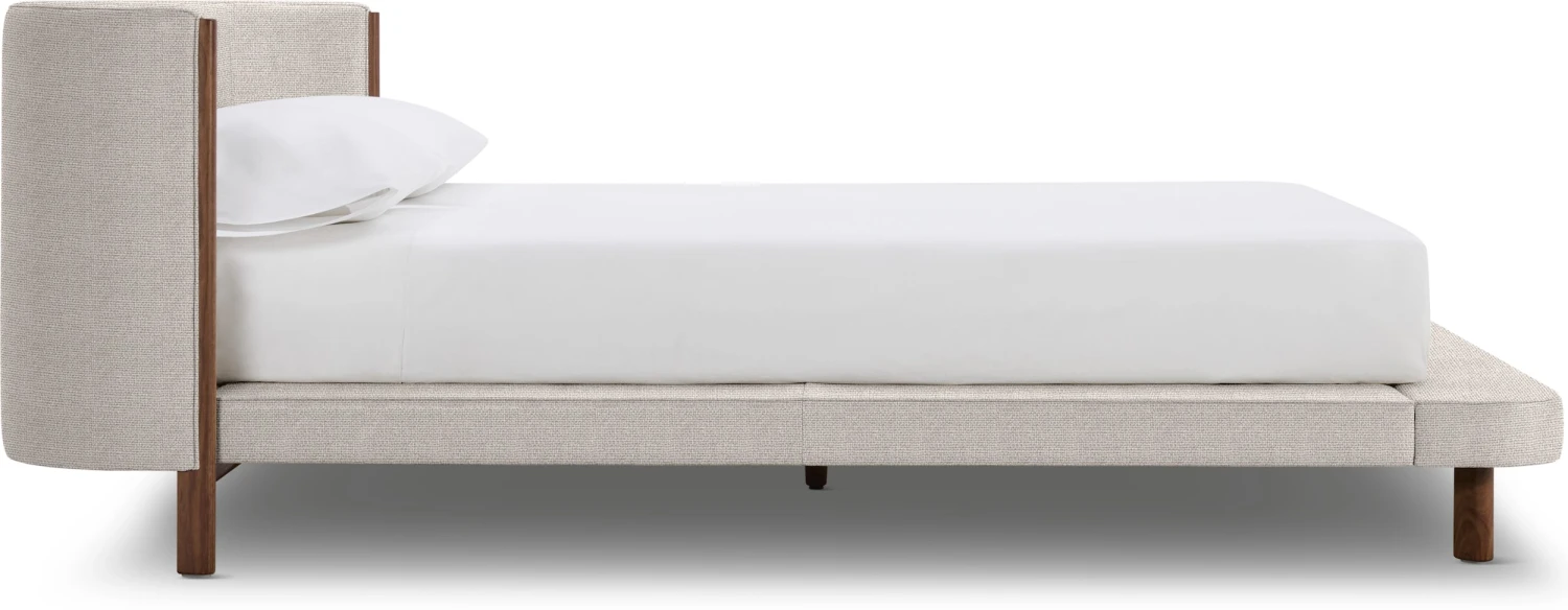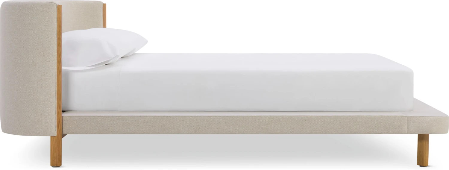 - Low upholstered platform on solid wood legs.