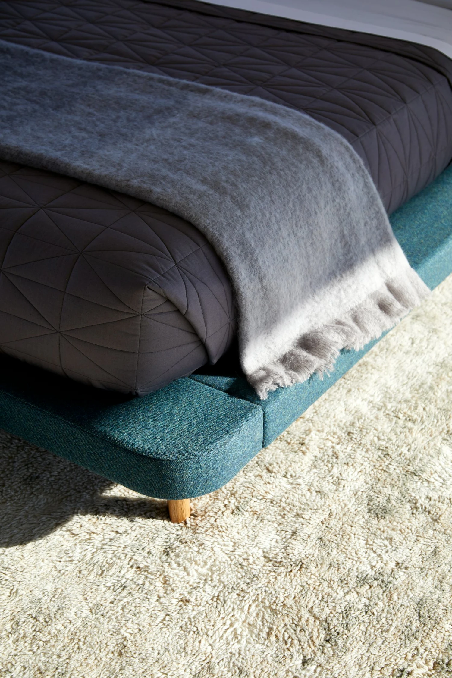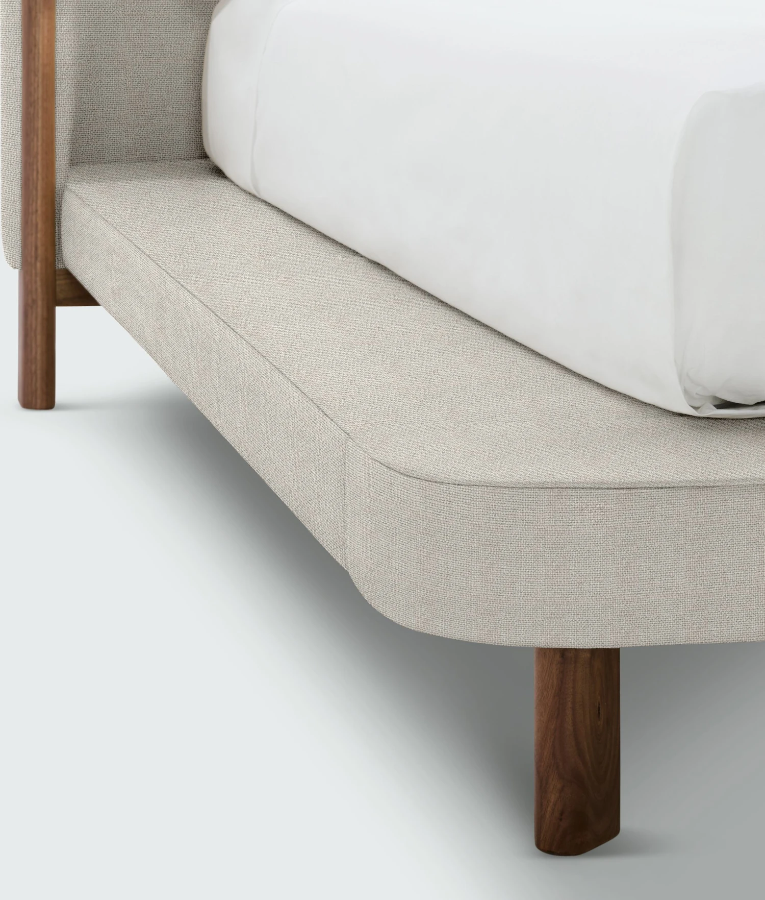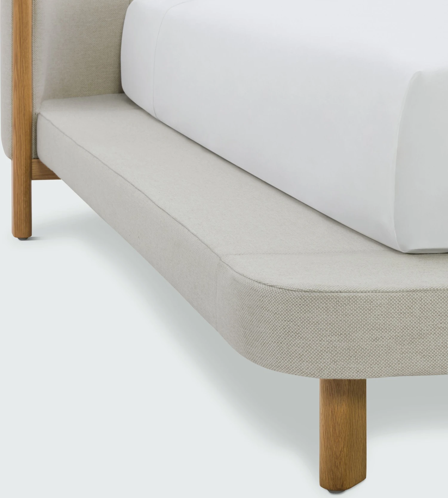 - Low upholstered platform on solid wood legs.