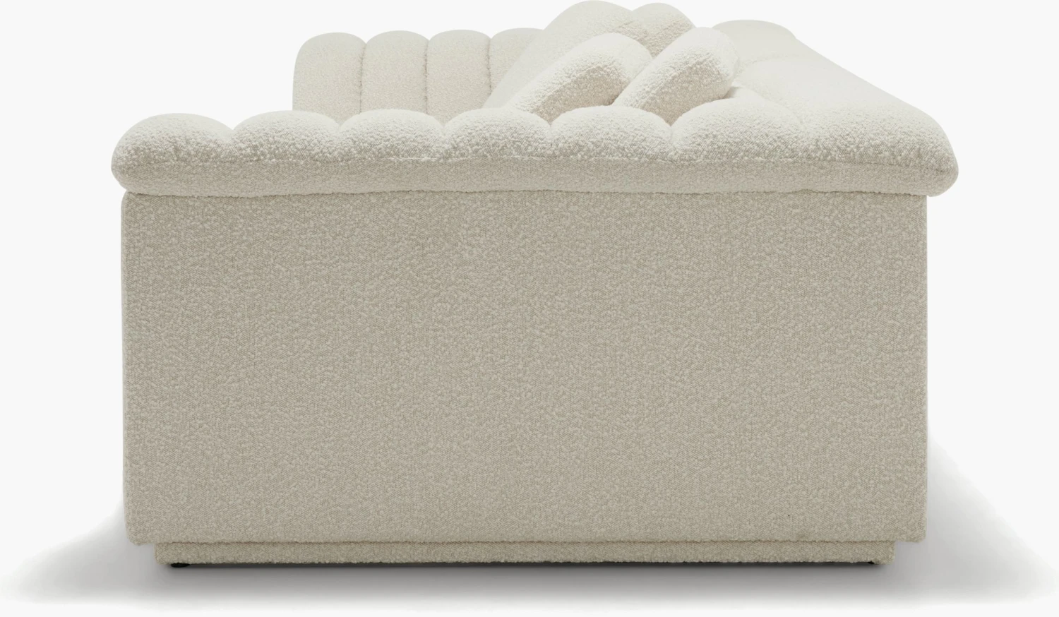 While designing her new Float Sofa (2023), Sarah Ellison was inspired by 1970s conversation pits – with the goal of “encouraging connection through design,” she says. The result: A welcoming, generously sized seating collection with extra-plush channel tufting, deep seats, and wide sloping armrests for comfort from every angle. High-density foam fills the channels for extra cushioning. Float is upholstered in velvet or bouclé fabric, and Ellison developed “Piccolo,” the rich chocolate brown velvet, specifically for this collection. Made in China.