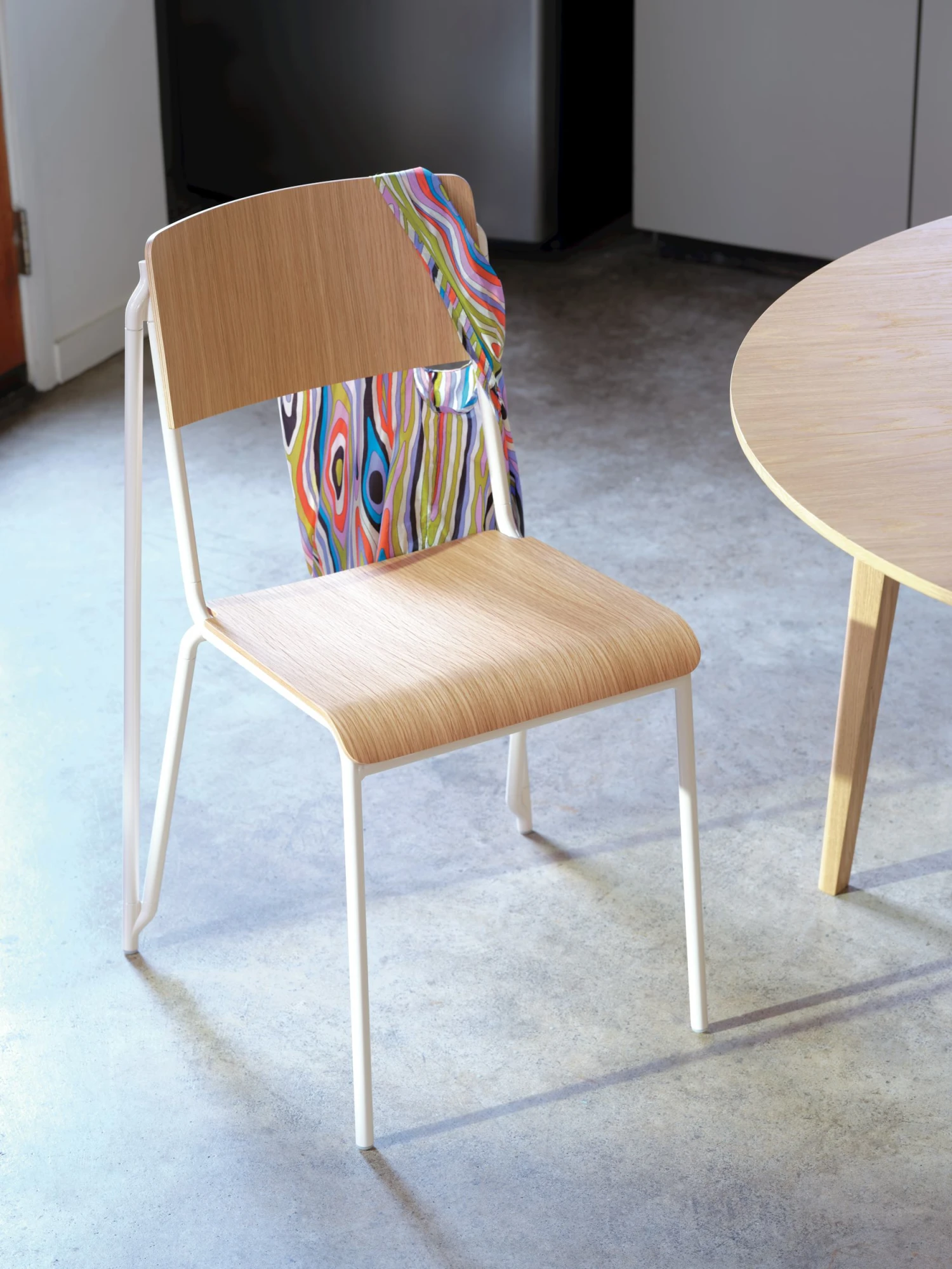 Geometric precision drove the development of Petit Standard Chair (2020). Designer Daniel Rybakken wanted to create a chair whose legs didn’t bow out awkwardly to accommodate stacking. What resulted was a chair engineered with six aluminum joints at the top, middle, and feet of the chair that connect durable steel tubes at precise angles to both provide support for the sitter with the added function of stacking. Its bent plywood seat and seatback are pitched and curved to encourage an ergonomic posture while its seat features a waterfall edge for added comfort. The finished design pays homage to famed designer Jean Prouvé’s Standard Chair (1934), which features similar geometric proportions.