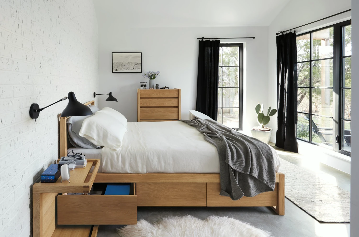The bed with storage has six (three on each side side) full-extension drawers, providing ample space for clothing and bedding, all of which can be quietly accessed without disturbing your partner thanks to soft-closing glides.