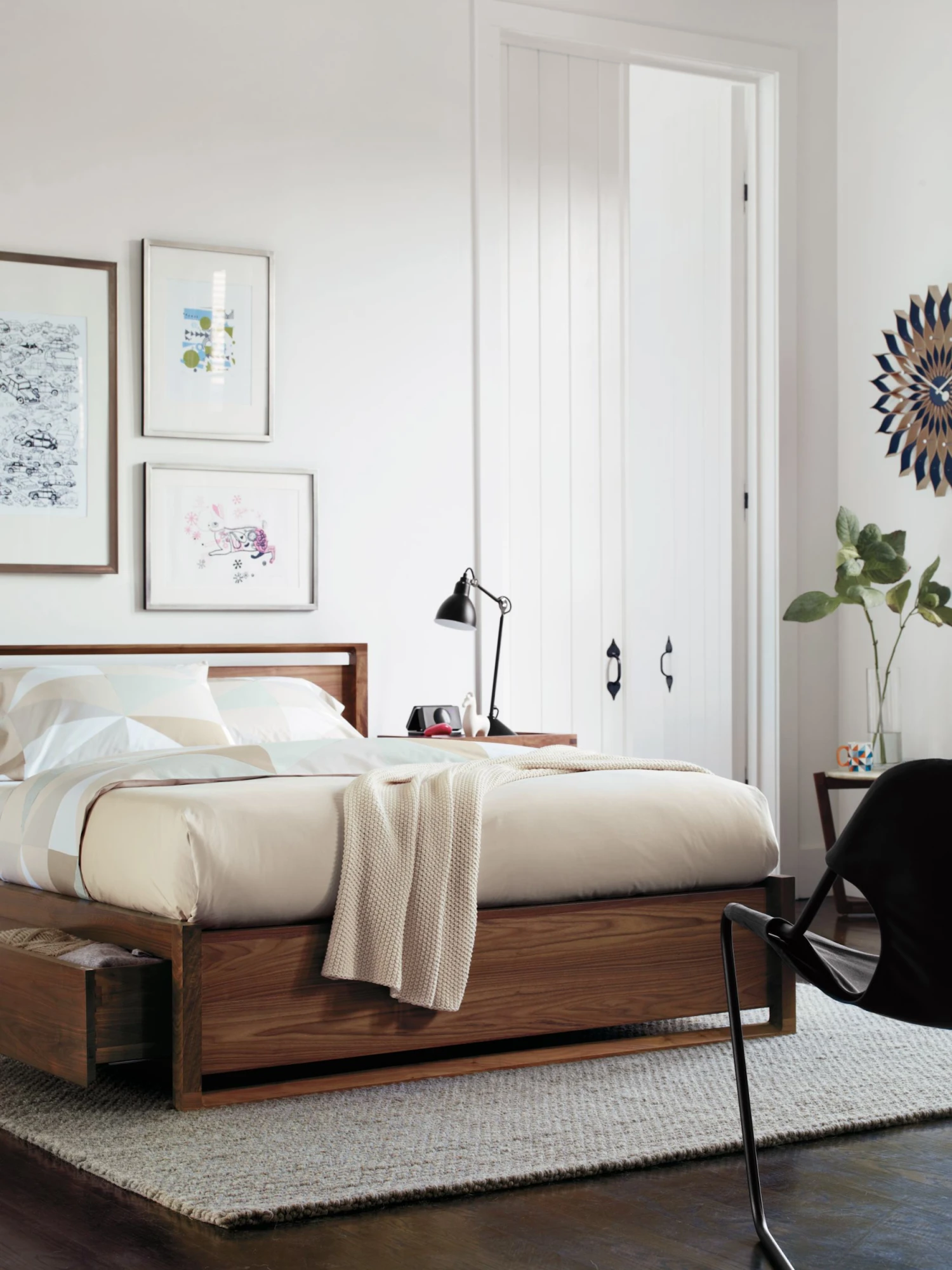 The bed with storage has six (three on each side side) full-extension drawers, providing ample space for clothing and bedding, all of which can be quietly accessed without disturbing your partner thanks to soft-closing glides.