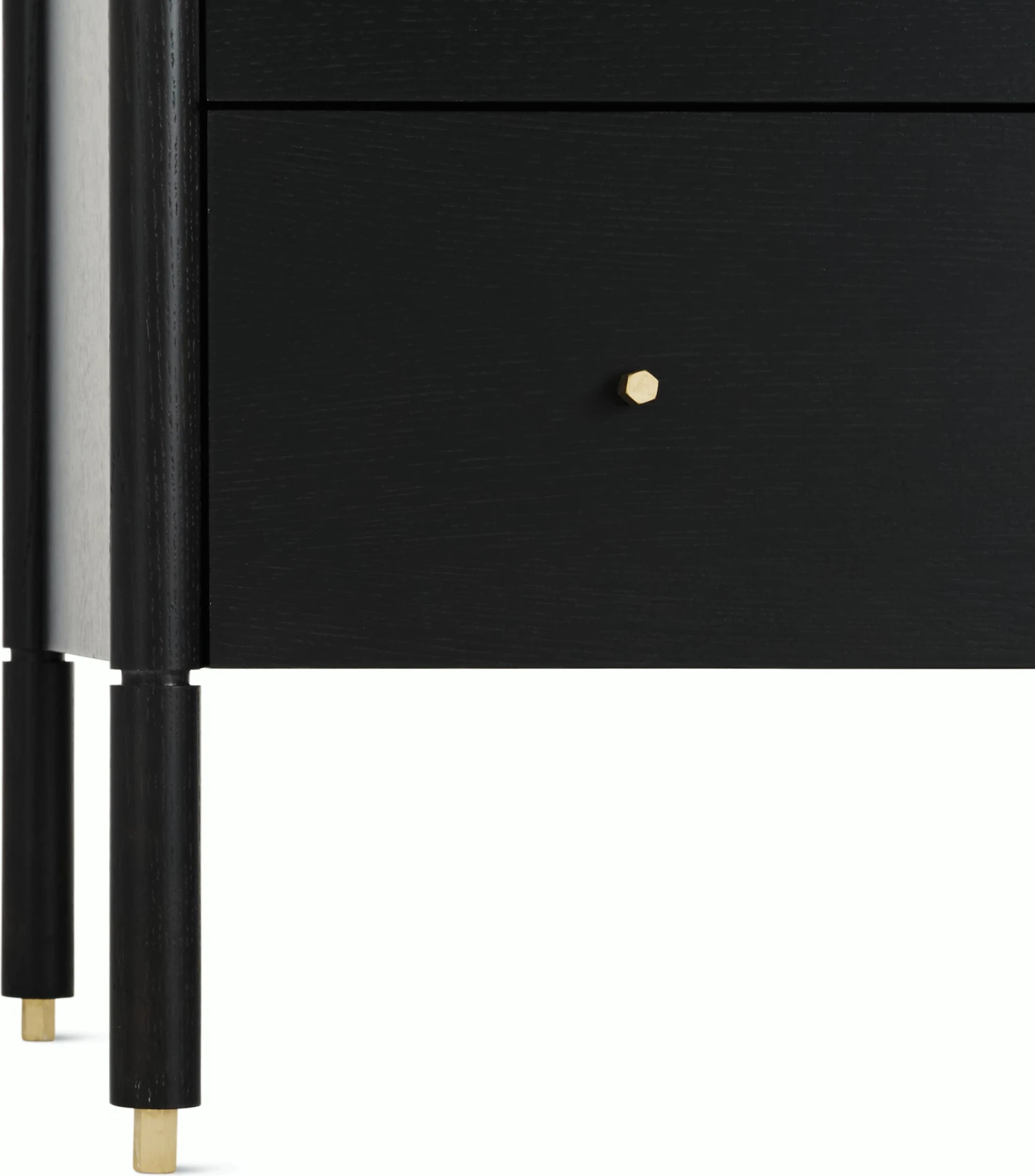 - Solid brass knobs and leveling feet; soft-closing hardware.