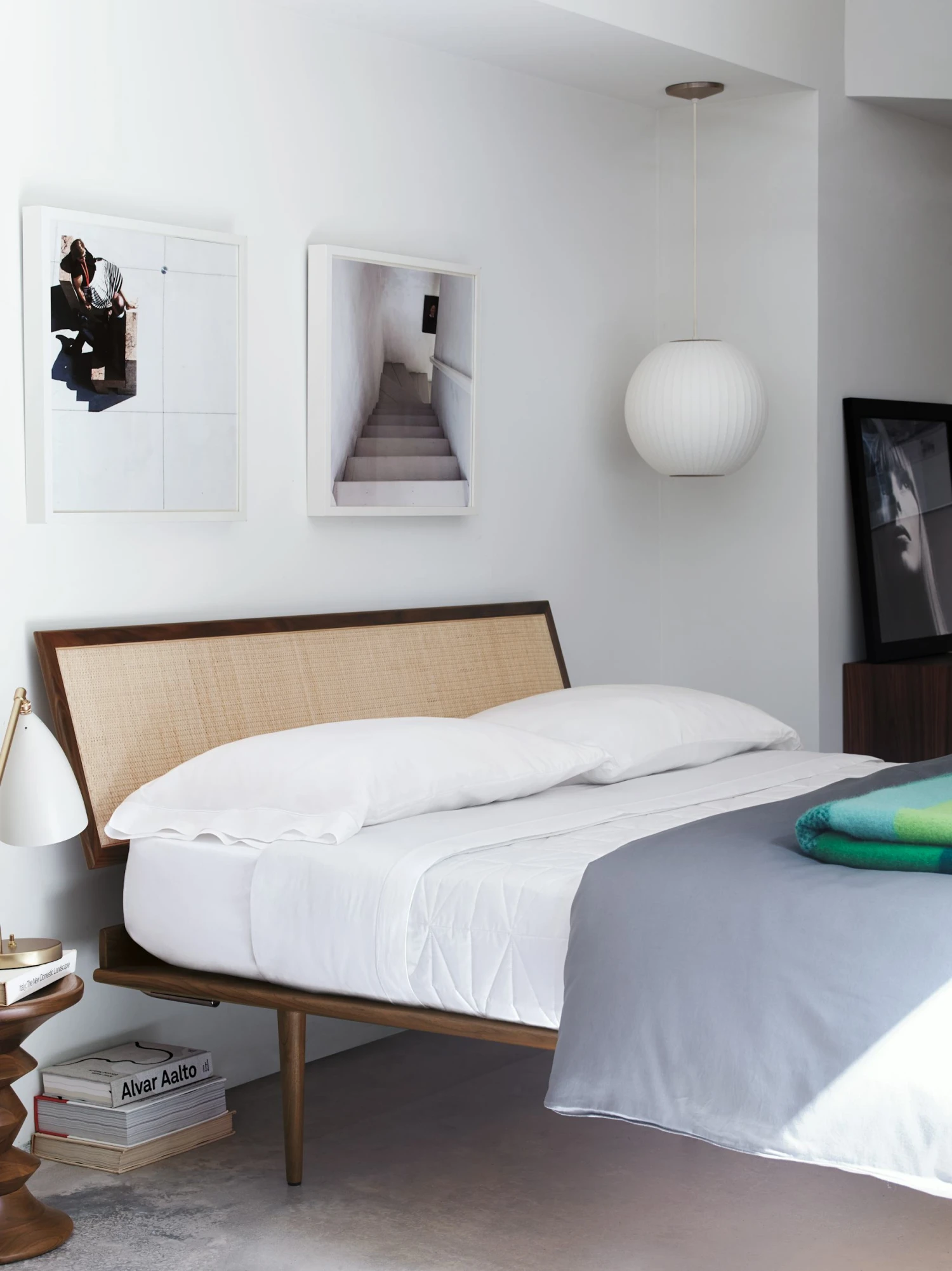 - Walnut or white ash veneer headboard with or without natural woven cane pane