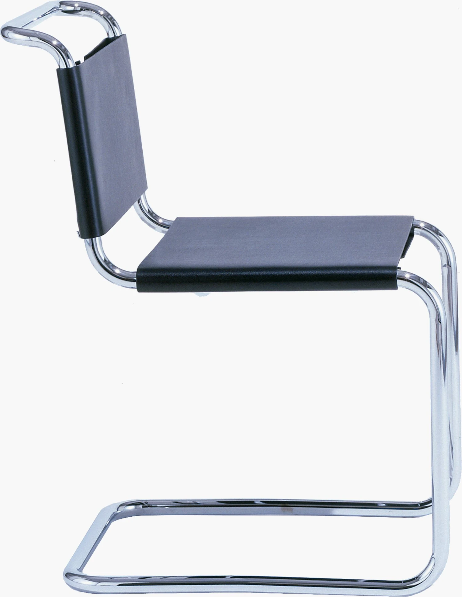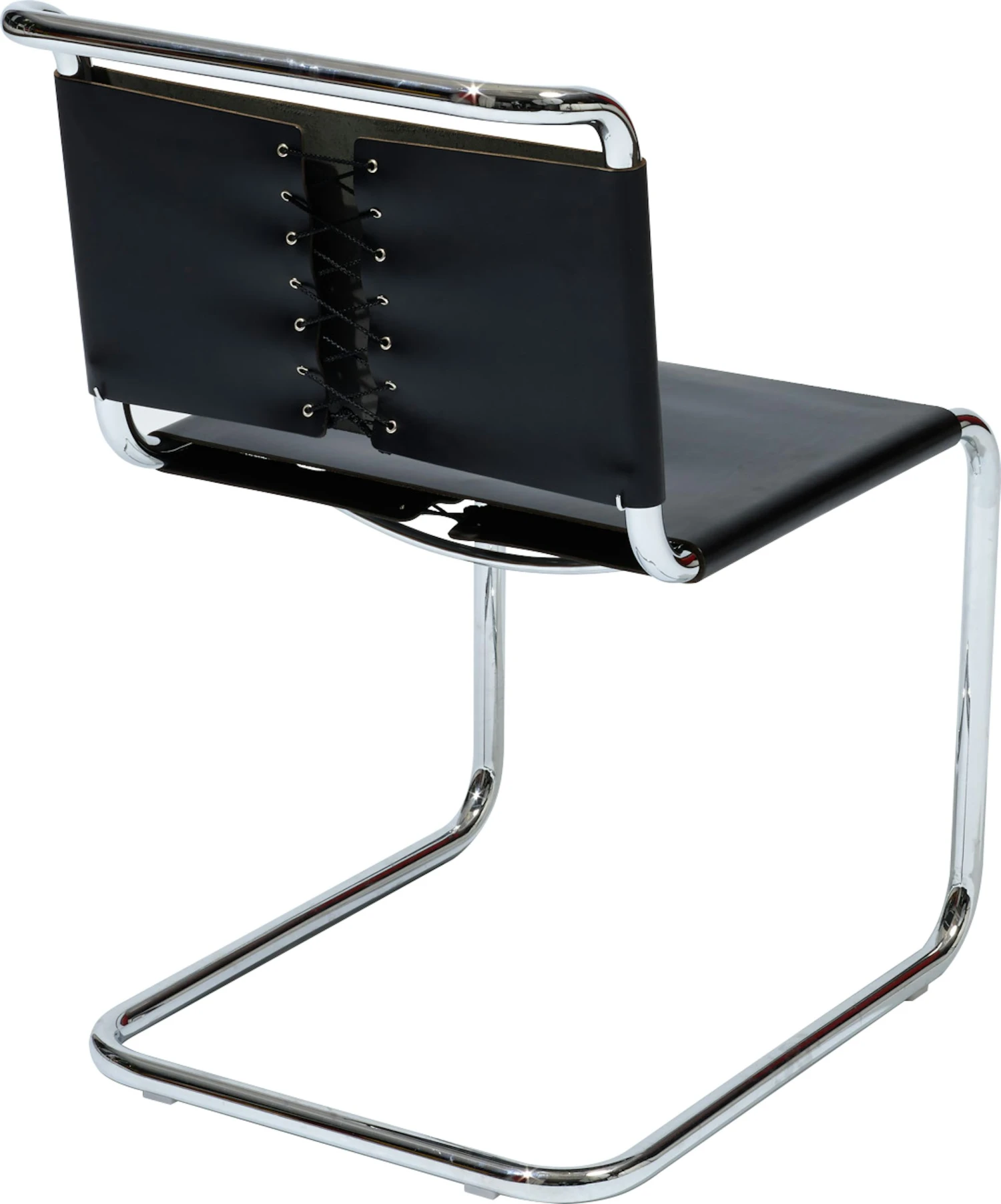 The compact footprint of the Spoleto Chair (1971) makes it suitable for conference tables, dining areas, kitchen nooks, or office spaces. It’s upholstered in whole-hide, thick cowhide leather that forms a taut sling with just the right give for a comfortable seat and back. Seamless polished chrome tubular steel frame provides a gentle bounce. Made in Italy.