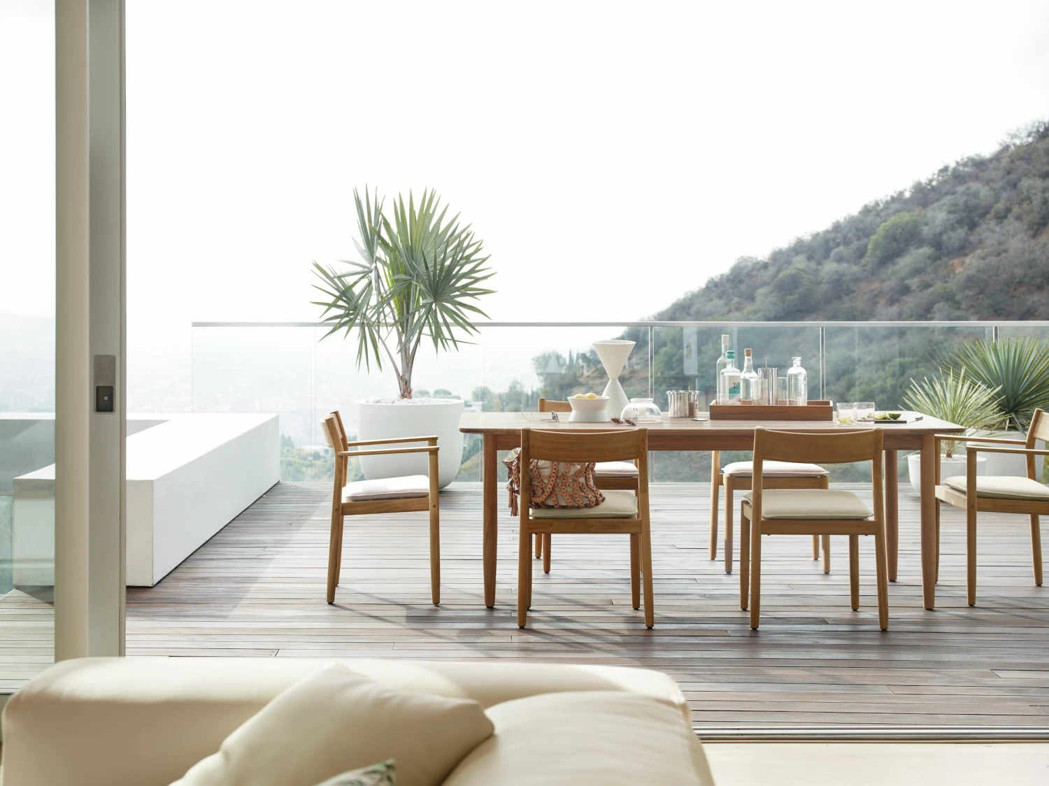 We recommend customized DWR rain covers for teak furniture left outdoors for long periods of inclement weather. DWR rain covers are breathable to mitigate mildew growth. In winter, store in a shed or garage. Store cushions separately to prevent transfer of moisture.