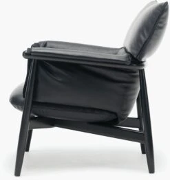 - Sculptural solid wood frame with wraparound backrest and arm support.